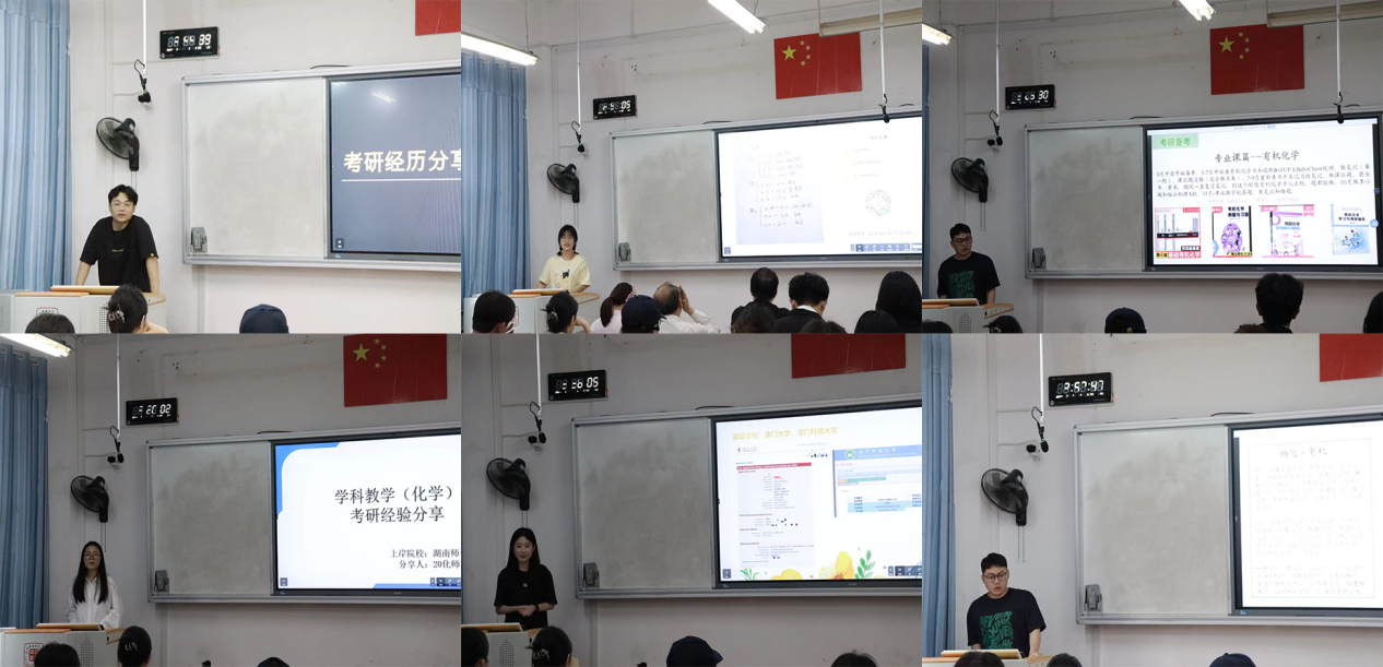 2020级应用化学(职师)1班刘五秀学姐则分享了她的考研学习时间规划和学习经验,同时还给同学们推荐了自己备研所用的教辅书;2020级应用化学(职师)2班罗心悦学姐则鼓励同学们在着手考研的同时也可以考虑出国留学,并简述了留学所需注意的相关事项。