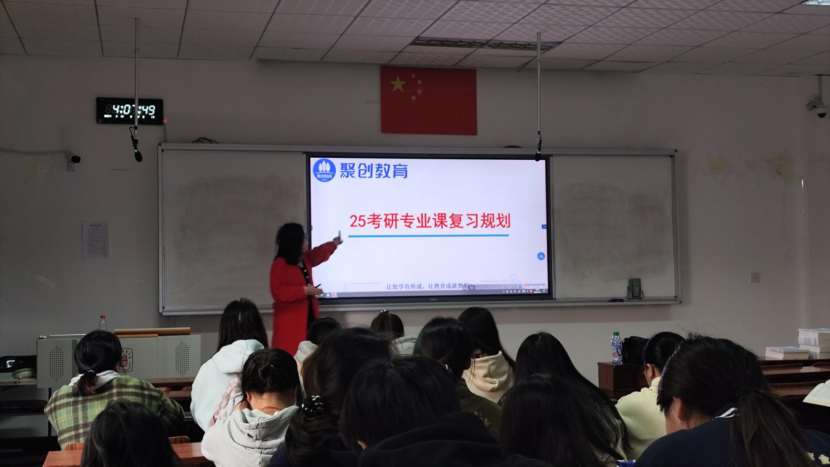 本次讲座由优秀校友企业——聚创考研的胡路老师主持。讲座内容涵盖了考研政策解读、学科知识点梳理、复习方法和心理调适等方面。主讲老师胡路首先讲述了备战考研中会遇到的问题,随后讲述专业科目考试是怎样进行的,考试中发放的信封拆封注意事项,胡路老师还向同学们分享了一些寻找考研复习资料的途径,助力同学们的考研复习。最后,胡路老师还分享了自己这些年遇到的一些考生的错误复习方式,告诫同学们要选对复习科目,不然到头来复习成果只能是“竹篮打水一场空”。