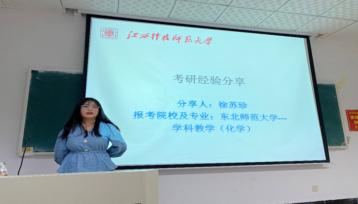 大会的第二项是由已经录取了研究生的学生代表分享考研经验。录取至南方科技大学的严泽恩同学向同学们分享了备考过程中的学习重点及刷题策略。录取至江南大学的奚子琪同学向同学们讲解了跨专业报考的相关事宜及院校选择。最后由录取至东北师范大学的徐苏珍同学向同学们分享学科教学备考方向和各科目复习时间安排。