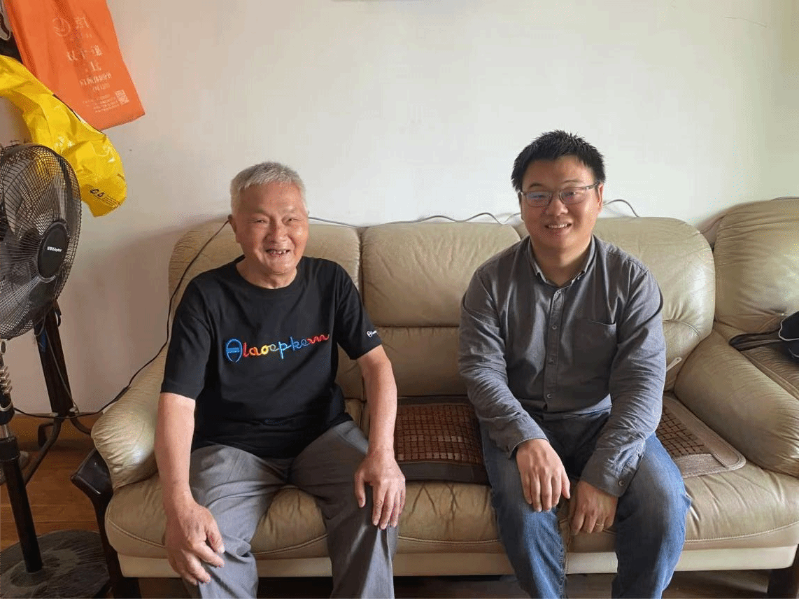 8827太阳集团副院长吴亚芊和分工会许乐群老师在退休教师程玉峰家与程老师进行亲切交谈。