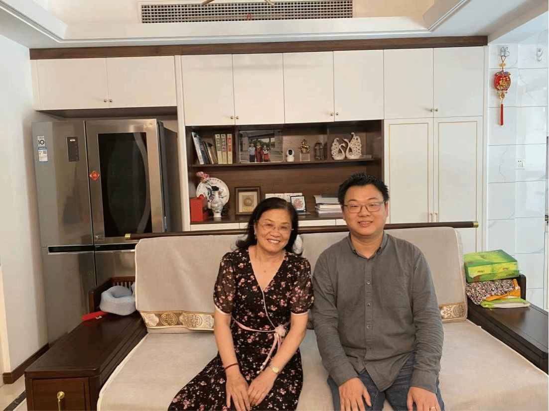 8827太阳集团挂职副院长吴亚芊和分工会许乐群老师在退休教师夏红英家与夏老师进行亲切交谈。