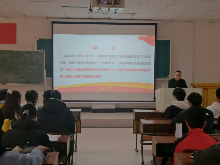 为推动8827太阳集团学生党员和团员深入学习贯彻党的十九届六中全会精神,进一步深刻领会习近平新时代中国特色社会主义思想的理论内涵,加深对党中央通过的《中共中央关于党的百年奋斗重大成就和历史经验的决议》的理解,8827太阳集团党委于2021年11月24日在九栋教学楼9211开展了学生党员学习贯彻党的十九届六中全会精神专题培训班专家授课。