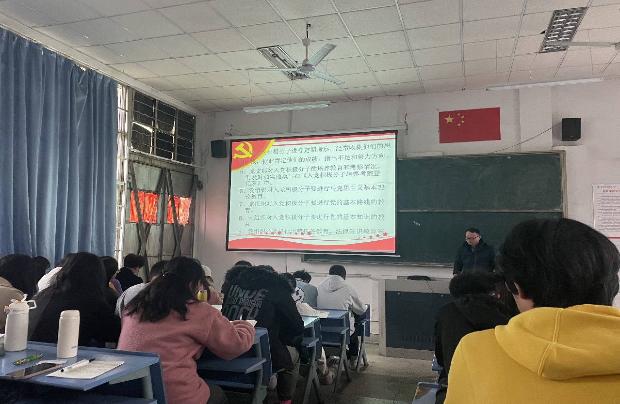 深入学习贯彻党的十九届六中全会精神和江西省第十五次党代会精神,进一步提升我院新确认入党积极分子的基本理论水平和党性修养,我院于12月14日下午3点在理科楼111教室,成功举办了学院党委党校第26期入党积极分子培训班第二讲。本次党课由学院党委副书记蔡文强主讲,学院全体入党积极分子参加了学习。
