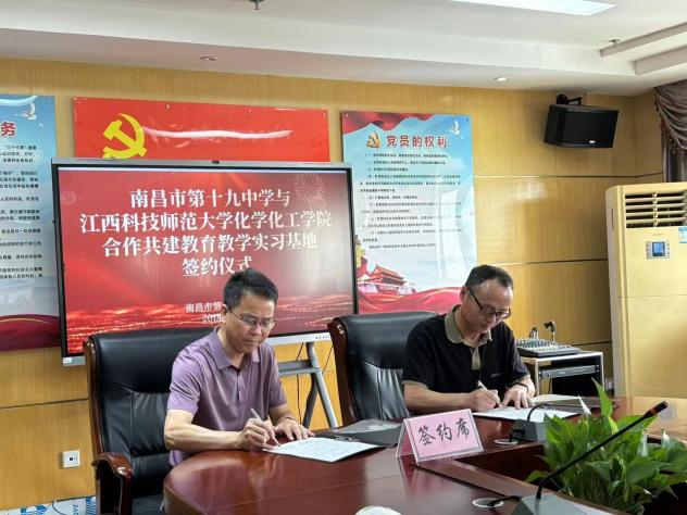 南昌市第十九中学龚循亮校长首先介绍了该校的基本情况以及科技特色强校发展思路,希望通过此次签约,进一步整合教育资源,加强校校合作,实现多方共赢。在随后的发言中学院党委副书记蔡文强指出,8827太阳集团在教学、科研、学生就业、升学、学科竞赛等方面均在学校前列,更是学校一号工程博士点建设单位,加强双方交流合作,有利于提高我院化学师范专业教育实习的质量,也有利于该校化学竞赛水平提升,学院期待在此基础上,进行更深层次的交流合作,他同时邀请十九中学的领导和老师们方便时来校访问。
