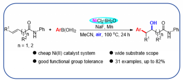 β-芳基乙醇基团常常存在于生物和药理活性分子以及天然产物中。由于未活化烯烃本身的低反应活性、极化降低和较高的β-氢消除倾向,利用廉价金属催化剂来实现未活化烯烃的直接选择性芳基羟基化反应仍然具有挑战。该论文通过C(sp3)-C(sp2)和C(sp3)-O键的连续形成的策略,实现了一种新型有效的镍催化未活化烯烃与芳基硼酸的选择性芳基羟基化反应。β,γ-和γ,δ-烯基酰胺,包括传统的内烯烃底物均可以反应,制得β-芳基乙醇化合物。实验证明,该反应最终产物游离的羟基容易进一步的转化为其他官能团。在对照试验中得出空气中的氧气是反应中羟基氧的来源,该反应也是首次报道了在空气下的镍催化未活化烯烃的芳基羟基化反应。