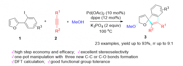 二氢呋喃是一类非常重要的化合物,广泛存在于具有生物活性的天然产物中。但是,已报道的此类化合物的合成方法还存在一些不足之处,所以,发展新的高效合成二氢呋喃类化合物的方法具有重要意义。呋喃是一类富电子杂环芳烃,芳构化能比较低,容易发生去芳构化反应。但是,通过过渡金属催化的呋喃去芳构化策略合成二氢呋喃化合物,需要经过烯丙基金属异构,并且产物具有两个立体中心,所以,要实现呋喃去芳构化2,5-双官能团化仍具有较大挑战。该论文通过钯催化呋喃衍生物,炔烃和醇的三分子去芳构化3+2环加成策略,成功构建了一系列二氢呋喃化合物。值得注意的是,该反应产物的非对映选择性是专一的,后期有可能使用手性配体,得到高对映选择性的二氢呋喃化合物。含有不同官能团的反应底物在该体系中都能适用,甚至溴代的二苯乙炔也能得到中等产率的目标产物。最后的机理研究表明,非对映选择性专一可能是因为位阻的原因。