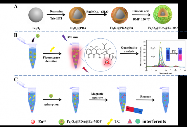 四环素作为一种广谱抗生素,因其良好的口服吸收、成本低和优异的抗菌能力已被广泛应用于水产养殖、医药和畜牧业。然而,由于四环素的滥用与排放,越来越多的四环素残留在动物产品和水体,同时四环素很难在人体内完全代谢,对人类健康和生态系统功能具有极大的威胁。因此构建一种能在食品与水资源中快速、灵敏检测并实现去除四环素的材料极为主要。我校有机所科研人员采用层层包裹法设计了一种磁性功能化MOFs材料(Fe3O4@PDA@Eu-MOF),该材料对四环素展现出宽的检测范围(0.01–25mg/L)、低的检测限(2μg/L)、高的吸附容量(Qm = 144.9mg/g)以及选择性与抗干扰能力,并且能够实现在实际蜂蜜与牛奶中高灵敏检测四环素。本研究为设计新型核-壳-壳结构磁性MOFs提供了一种可行的策略,该类材料在四环素的分析、富集与去除中具有很大的实际应用潜力。