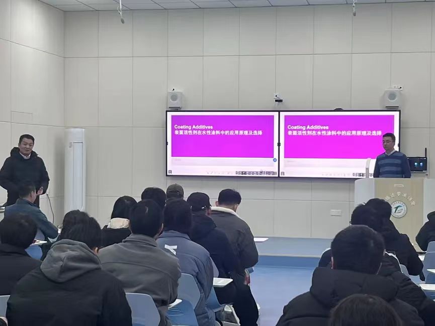 2023年12月26日下午,赢创特种化学(上海)有限公司技术主管戴晔博士应邀来校参加涂料与高分子系第十四届涂料培训班,在涂料工程楼标格达涂料报告厅给涂料与高分子系全体师生作了《表面活性剂在水性涂料中的应用原理及选择》的专题讲座,讲座由申亮院长主持。