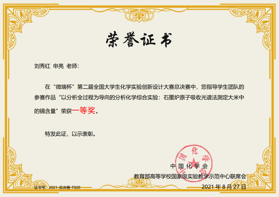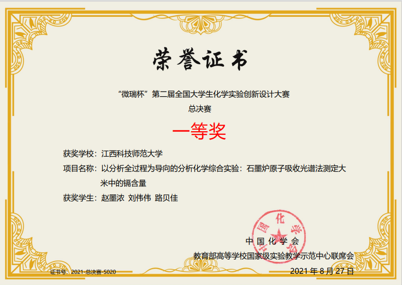 8月27日,由中国化学会和教育部高等学校国家级实验教学示范中心联席会主办的2021年“微瑞杯”第二届全国大学生化学实验创新设计竞赛全国总决赛在云端落下帷幕,由赵墨浓、刘伟伟、路贝佳同学组成的参赛团队荣获全国总决赛一等奖,指导老师为刘秀红、申亮。