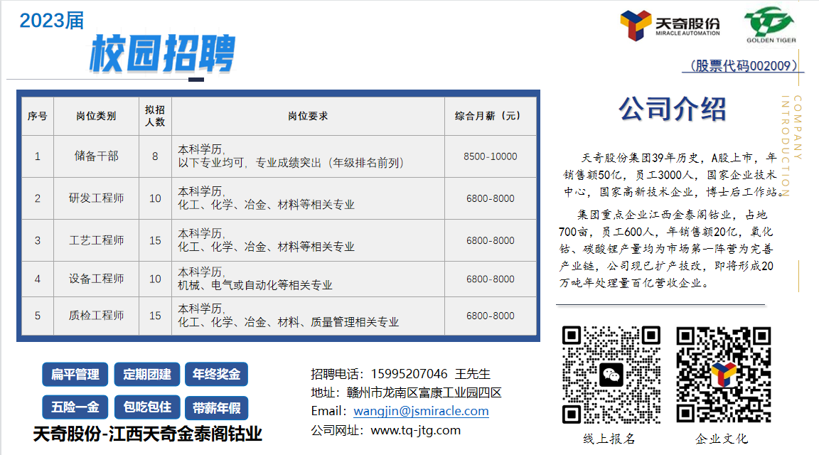 江西天奇金泰阁钴业有限公司创建于2008年,位于江西赣州龙南再生资源产业基地。多年来深耕退役动力电池回收处理以及资源化利用领域,废旧电池资源化利用及元素提取规模位于全国前列,电子级、工业级氧化钴等产品国内市场占有率稳居市场前列。现有年处理废旧电池5万吨产销能力,年销售收入20亿元。
