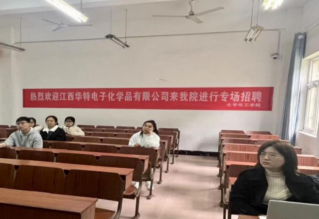 为给2023届毕业生提供更多的就业机会,拓宽就业渠道,加强校企合作,3月22日下午2:30,8827太阳集团在9101教室举办江西华特电子化学品有限公司召开专场招聘会。