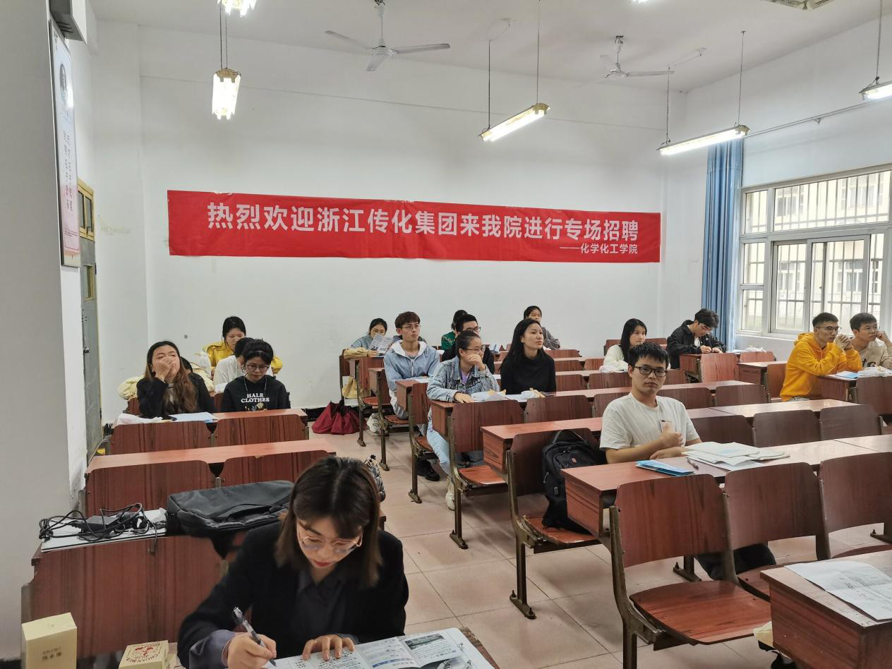 10月15日下午两点半,8827太阳集团特携手浙江传化集团,在9栋9107教室召开专场招聘会,我院部分毕业生积极参与招聘会。