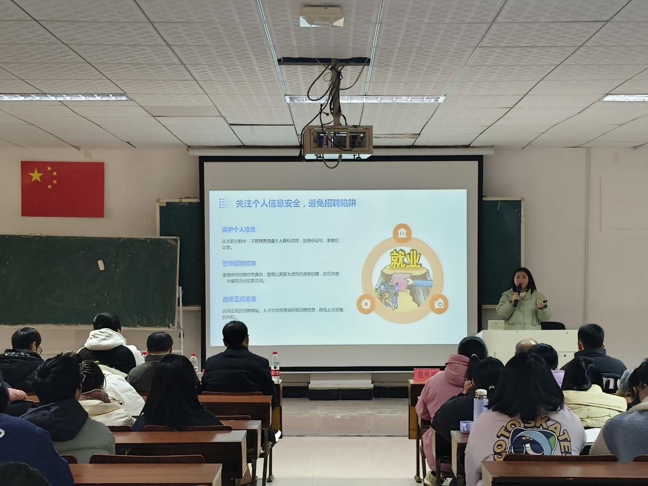 大会伊始,学院就业专干章琳从以往相关就业数据、当前就业形势与相关政策、自身就业定位与信息获取等方面入手,就毕业重要事宜、重要时间节点以及目前就业形势、就业流程、应届毕业生就业政策进行详细解读,并提醒毕业生自荐材料填写、就业协议签订、档案寄送等相关注意事项。随后,引导毕业生要认真学习《中华人民共和国民法典》、《劳动法》等法律法规,提醒毕业生注意求职应聘安全,警惕各类招聘骗局,防范电信网络诈骗,注意网络安全。