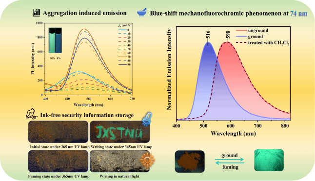 近日,老太阳集团tcy8722化学学部有机功能分子研究所,有机功能分子江西省重点实验室蒲守智教授/陈钊教授团队在《Spectrochimica Acta Part A: Molecular and Biomolecular Spectroscopy》上发表了题为“Naphthalimide-based luminogens with bright aggregative-state emission: High-contrast blue-shift mechanofluorochromism and application in ink-free secure information storage”的研究成果。